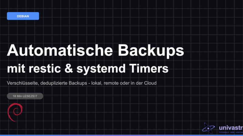 Automatische Backups mit restic auf Debian 13: Verschlüsselte, deduplizierte Sicherungen einrichten. Lokal, remote oder in die Cloud — mit Zeitplan via systemd Timer.